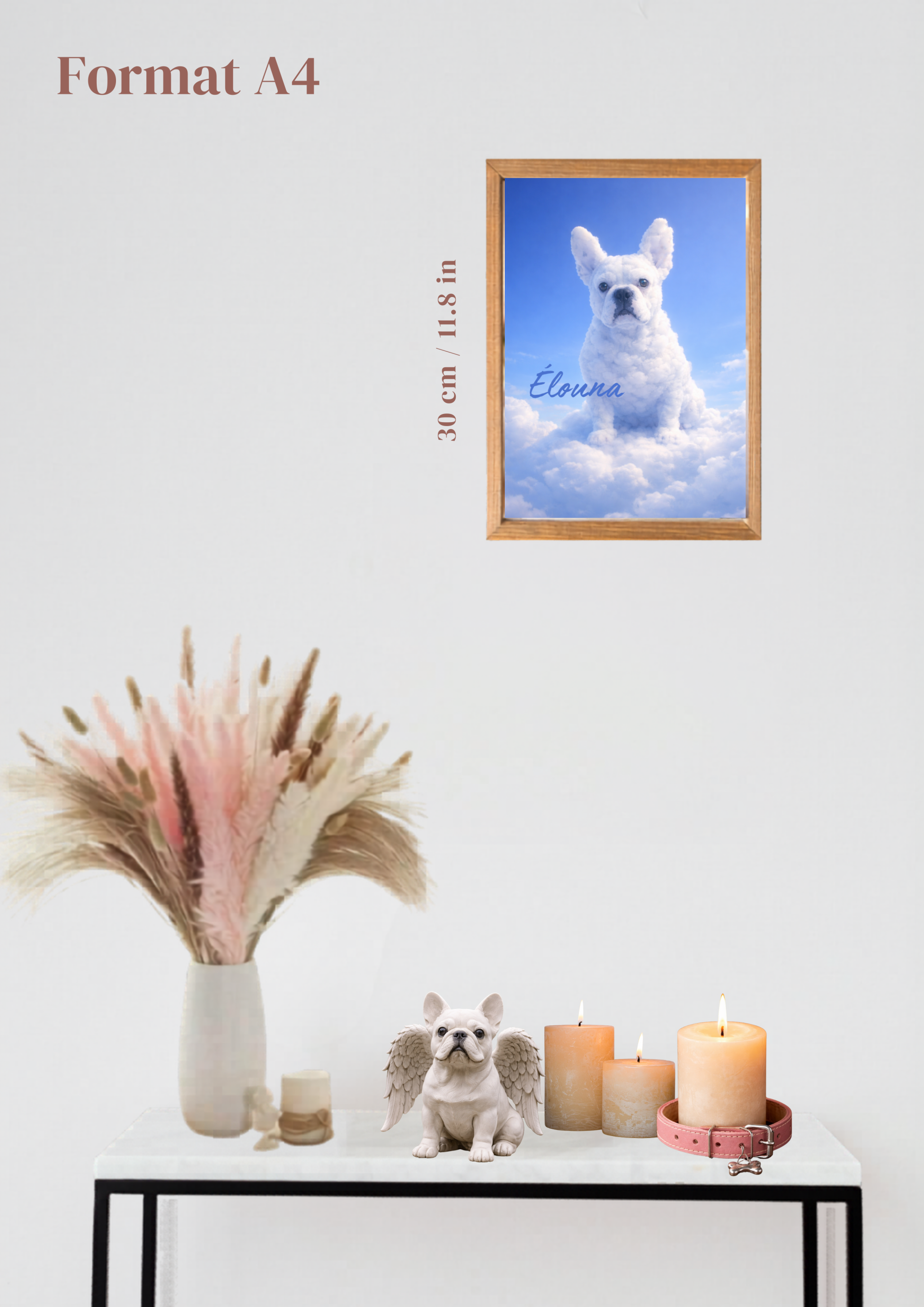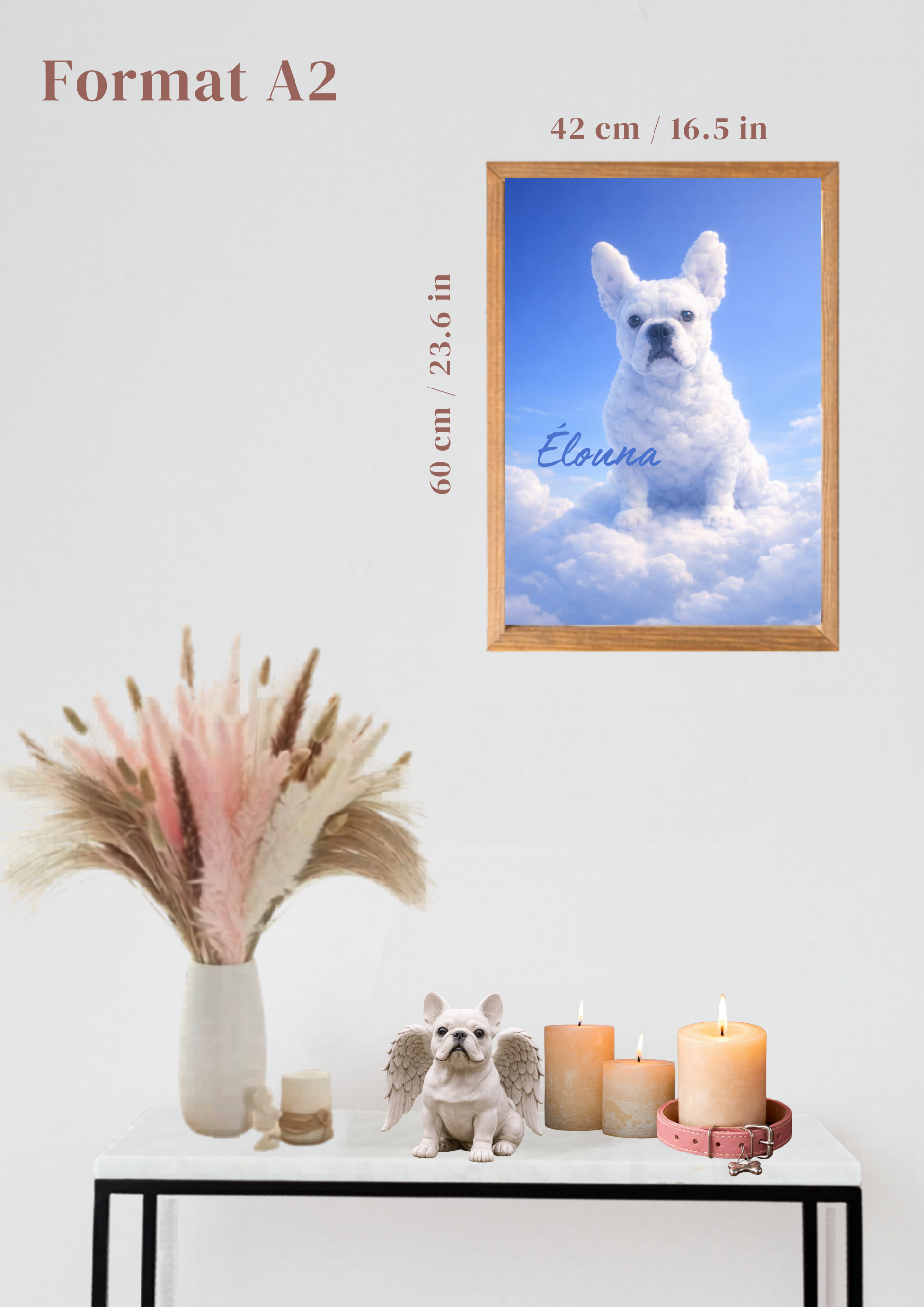 Gardez un souvenir doux et apaisant de votre compagnon avec ce poster mémorial personnalisé . Votre animal est représenté dans les nuages, symbole de paix, avec son prénom pour un hommage unique.